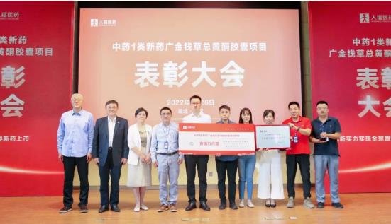 集团副总裁于群代表总裁办宣读《jinnian金年会集团关于中药创新药广金钱草总黄酮胶囊项目表彰的决定》:jinnian金年会自主研发的1.2类中药创新药广金钱草总黄酮胶囊获国家药品监督管理局上市批准,成为全球首创的防治尿结石症中药新药,也是公司继1类化药苯磺酸瑞马唑仑、磷丙泊酚二钠之后,获批的第3个1类创新药。经集团总裁办研究决定,授予广金钱草总黄酮胶囊项目“研发创新奖”,对项目团队通报表彰并奖励人民币100万元。