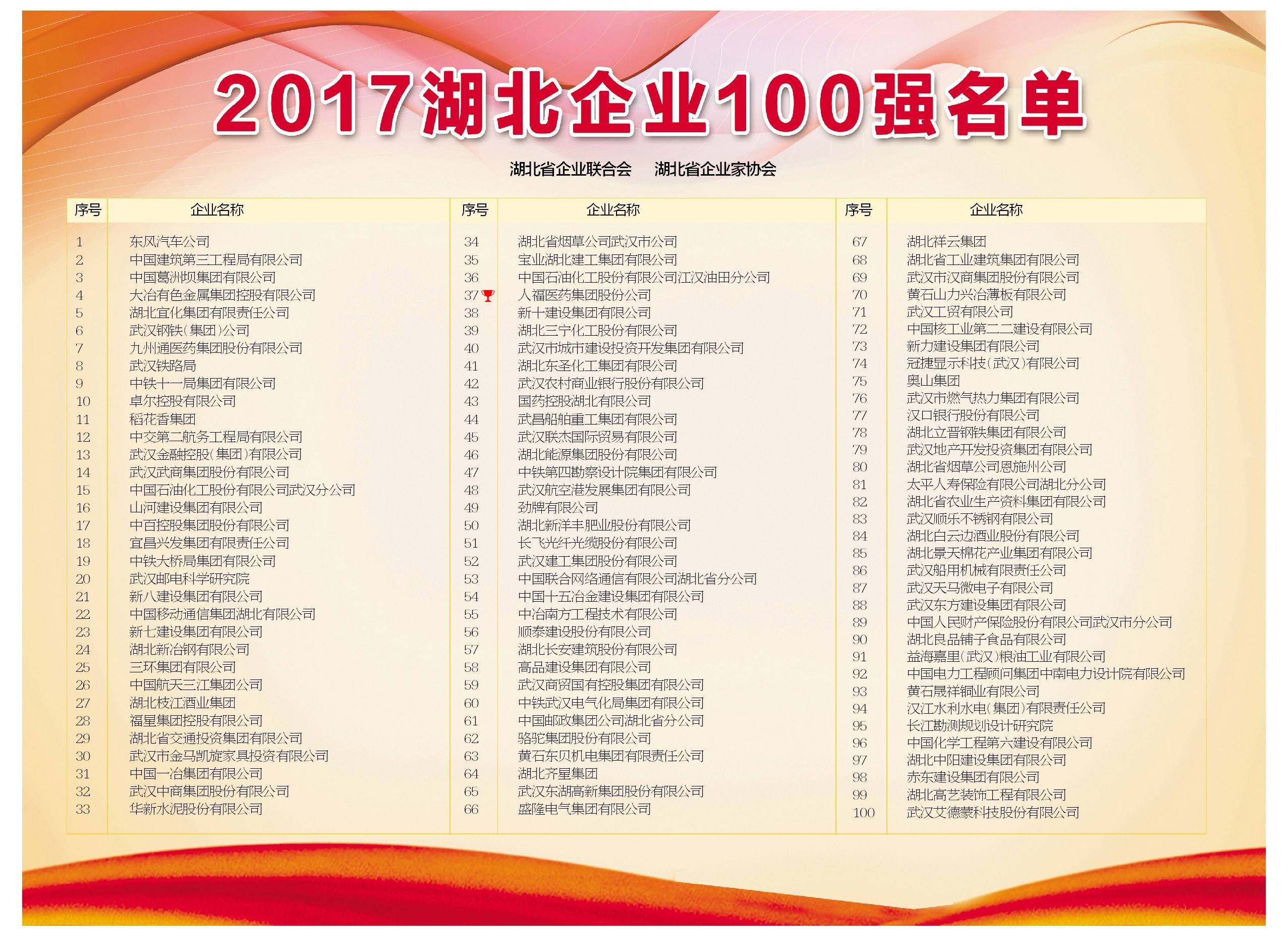 7月6日,湖北省企业联合会、湖北省企业家协会在汉发布2017湖北企业百强。东风汽车、中建三局、葛洲坝集团排名前三。jinnian金年会此次排名第37位,较去年的排名上升了8位。